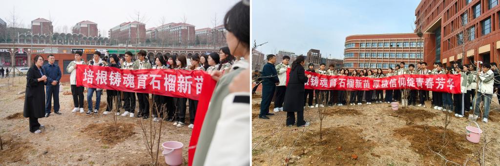 马克思主义公司副经理石峰老师现场为同学们上了一堂生动的思政课,她强调:“民族团结是根,文化交融是魂,让我们铭记,民族团结是社会稳定的基石,国家发展的动力。”铁锹翻动间,青年学子们将“像石榴籽一样紧紧抱在一起”的民族团结誓言深植沃土。车辆工程专业蒙古族员工艾晨希边培土边感慨:“每棵石榴树都挂有我们的成长寄语,这片树林见证着我们的团结奋进,也承载着我们对未来的期许。”