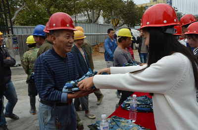 仪式现场,主持人先致开幕词。紧接着,李尊强先生致辞,他指出,民工是社会关注的弱势群体之一,同学们的捐赠,不仅仅是用自己的爱心为军训服增添了新的光彩,更是用自己的爱心去温暖了广大民工朋友在异地他乡漂泊如浮萍般的心,让他们不在畏惧萧萧寒风,同时也是给广大民工朋友的最真挚的问候和关怀,在此向各高校组织表示由衷的感谢。紧接着出席的员工代表向民工朋友们发放军训服,随着员工代表发放军训服的脚步,温情也随之在寒冷的空气中弥漫、发酵,让凛冽的风不再刺骨,让寒凉的空气也变得温暖如春。