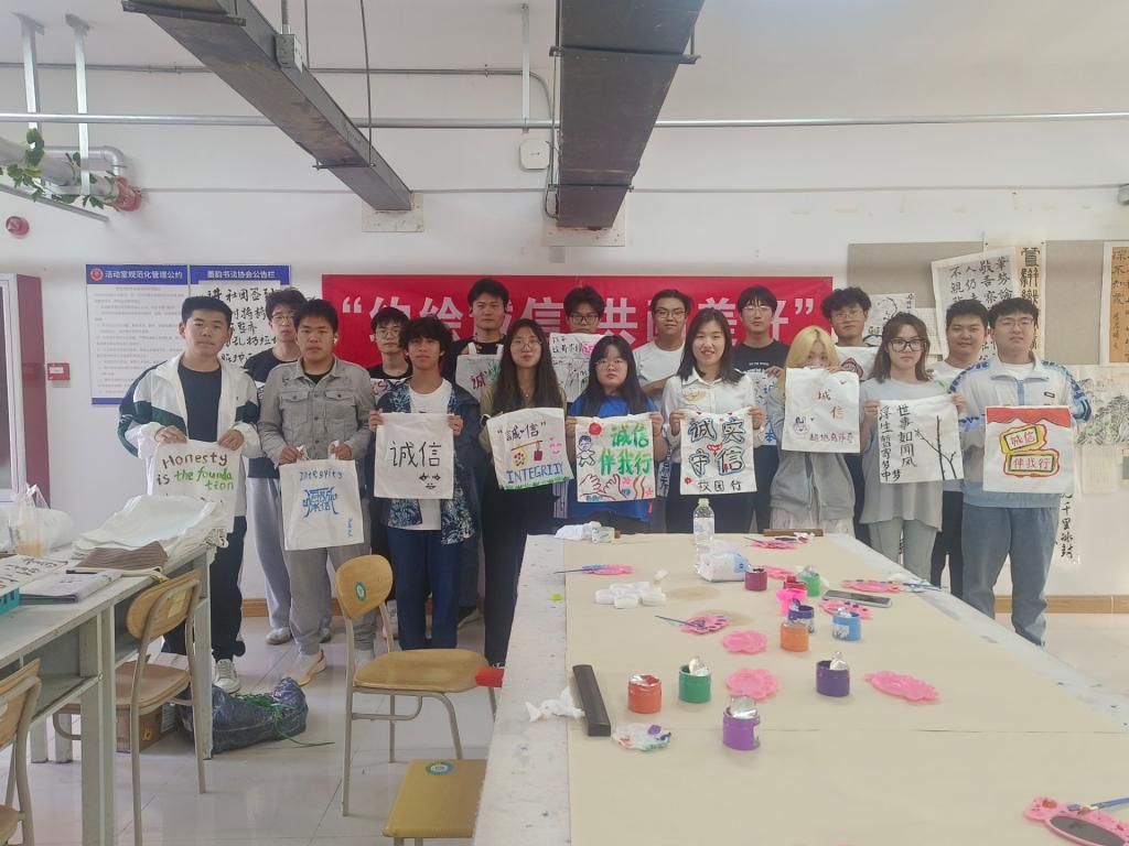 活动包括诚信标语设计和帆布包DIY绘画设计。诚信标语设计以设计诚信标语为主要内容,同学们写出代表诚信的标语,表达诚信做人、诚信做事的意愿;在约绘诚信,共画美好”为主题的帆布包DIY绘画设计活动,同学们发挥想象力和创造力在帆布包上绘制与诚信相关的图案,在活动中认识诚信的重要性,树立诚信品格