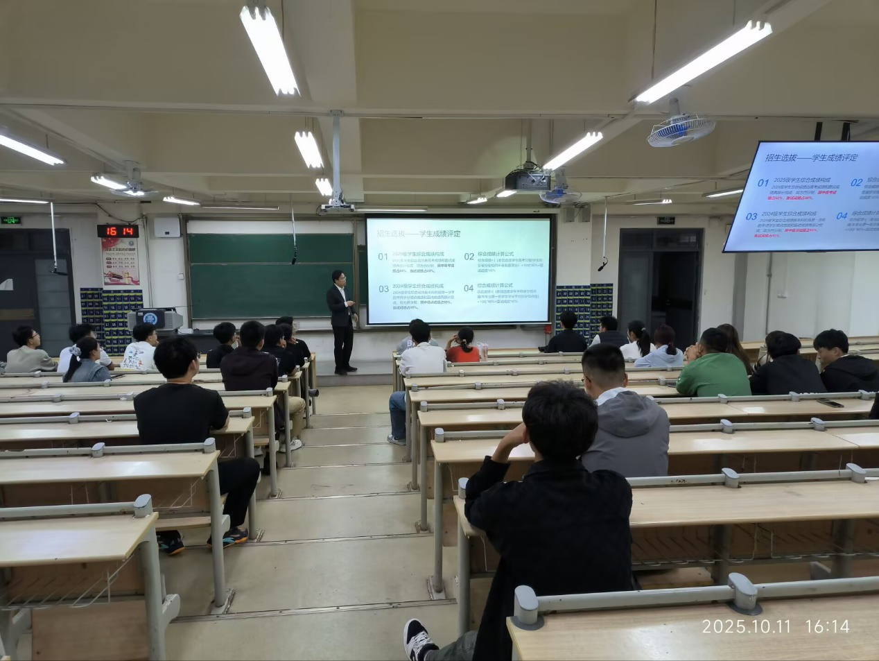 在现场互动环节,同学们踊跃发言,对个人所关心的问题进行提问,杨发展、郭阳分别对同学们的提问进行了细致的解答。