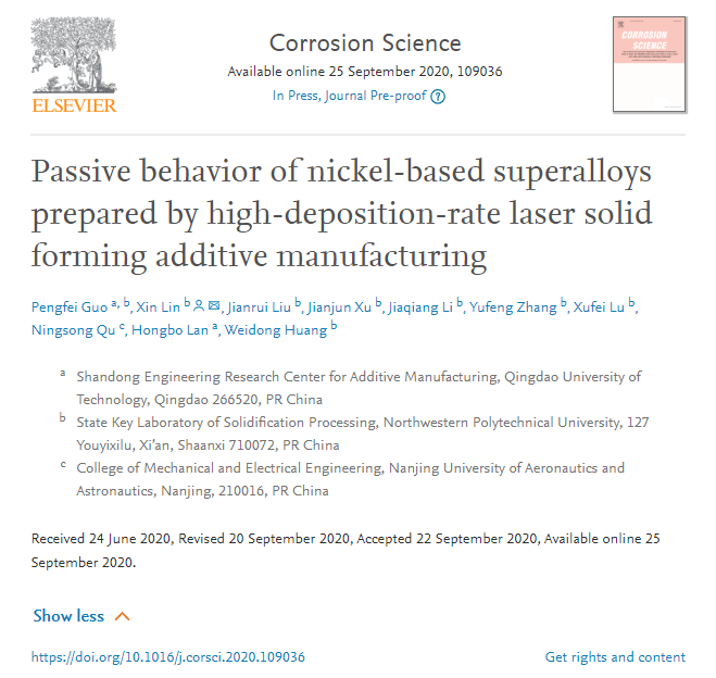 公司青年教师郭鹏飞博士联合西北工业大学黄卫东教授、林鑫教授团队和南京航空航天大学曲宁松教授团队,开展了航空发动机用镍基高温合金典型牌号Inconel 718合金(国内牌号为GH4169)的高沉积速率激光立体成形实验。基于激光熔池形貌及温度场数值模拟,揭示了高沉积速率条件下沉积态组织织构的演化规律;通过观察钝化膜的原子尺度结构、成分特征,利用点缺陷模型(Point Defect Model)理论,阐明了钝化膜诱导沉积态试样电化学活性各向同性的作用机理。相关成果以题为“Passive behavior of nickel-based superalloys prepared by high-deposition-rate laser solid forming additive manufacturing”的论文发表在材料腐蚀领域顶级期刊《Corrosion Science》上。论文链接:https://doi.org/10.1016/j.corsci.2020.109036。论文第一作者为公司申博SUNBET郭鹏飞副教授,第一署名单位为申博SUNBET山东省增材制造工程技术研究中心。该研究得到了科技部国家重点研发计划项目(No. 2018YFB1105901)的支持。